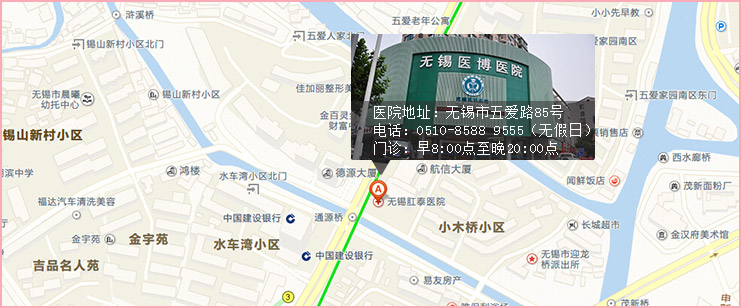 医院地址:无锡市南长区五爱路85号 咨询热线:0510-85889555(无节假日医院)